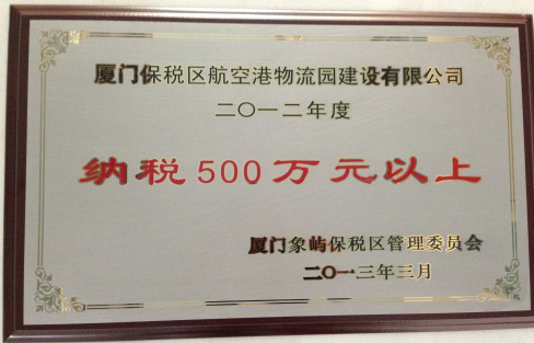 万翔冷链在 2012 年度纳税 500 万元以上,被厦门象屿保税区管理委员会评为年 度纳税大户,并颁发奖牌。