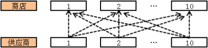 共同配送来源于生产或者 零售厂家的所谓“统配”的理 念。假设某零售商有10家门店, 同时有 10 个供应商为其供货。 那么,正常情况下,将有 100 条送货线路运行。如下图 1 所 示: