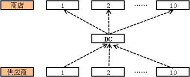 如果引入 DC(distribution center)的理念,则在相同条件下,送货运行线路将 改为 20 条。如下图 2 所示,对比图 1,运行线路将减少 80%。